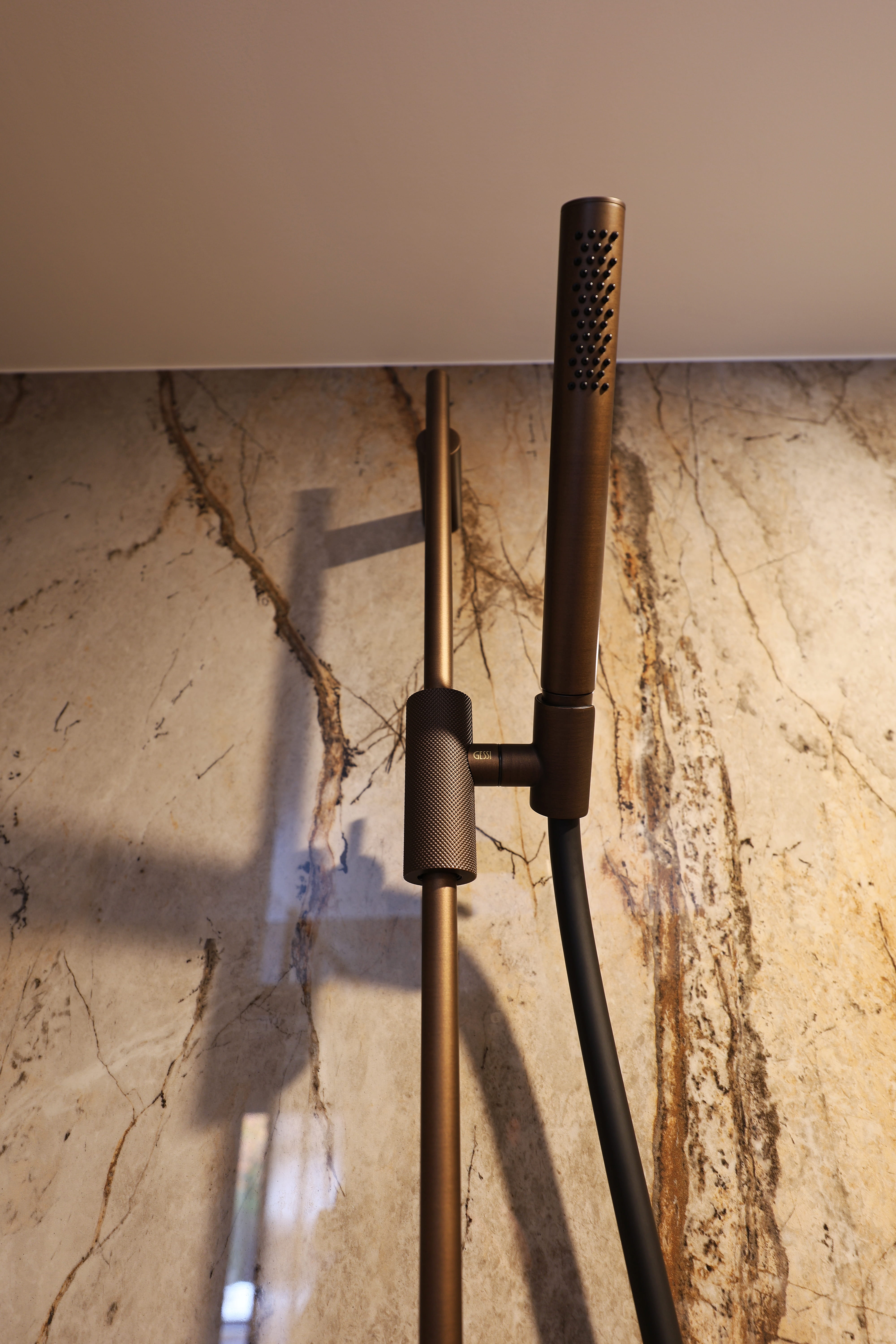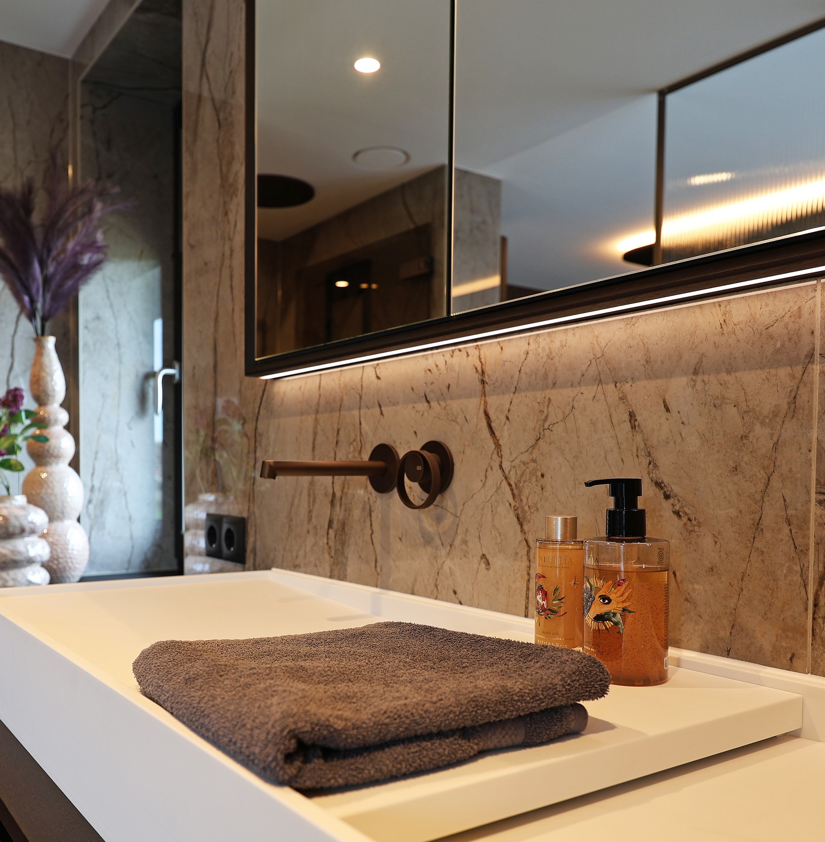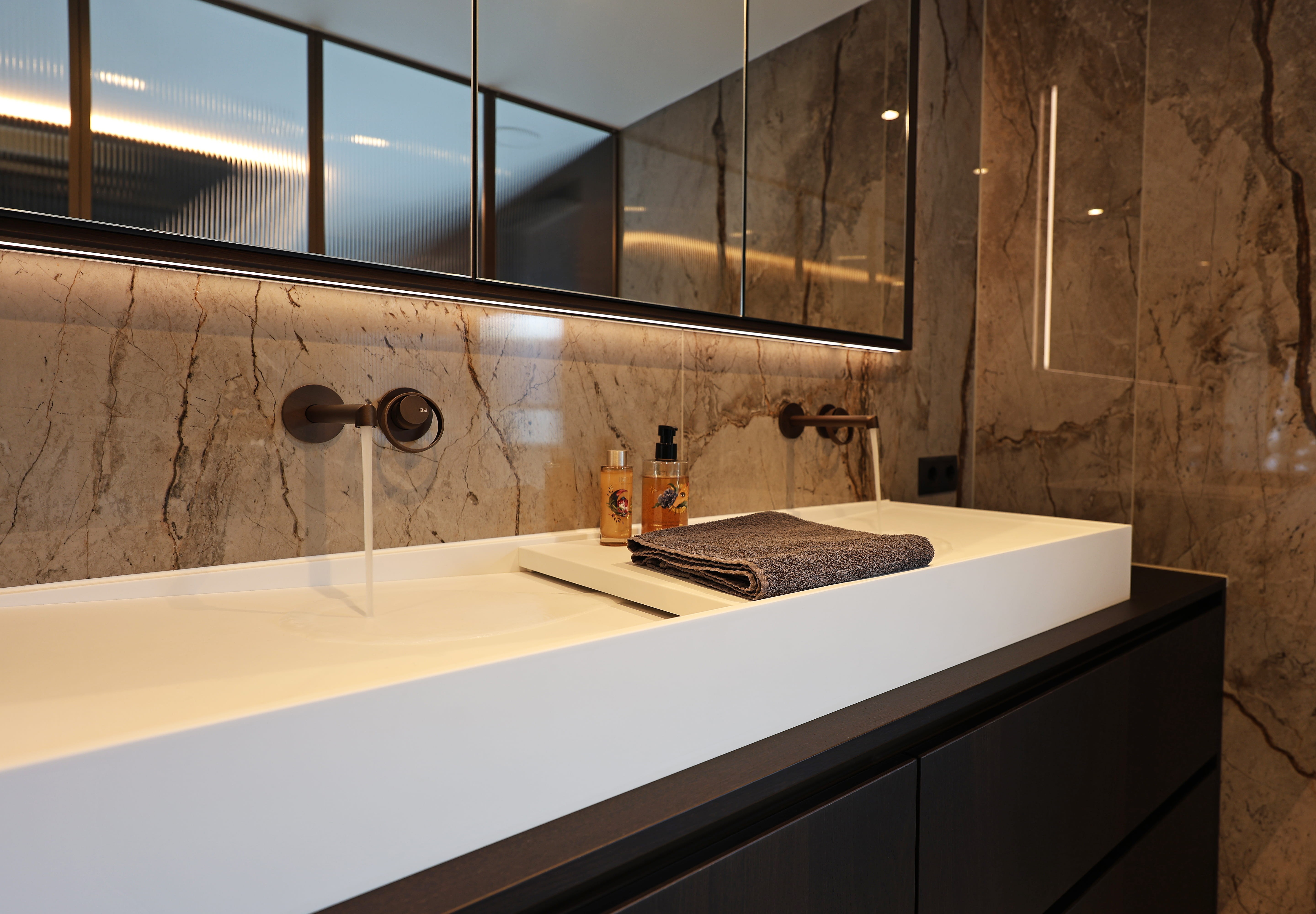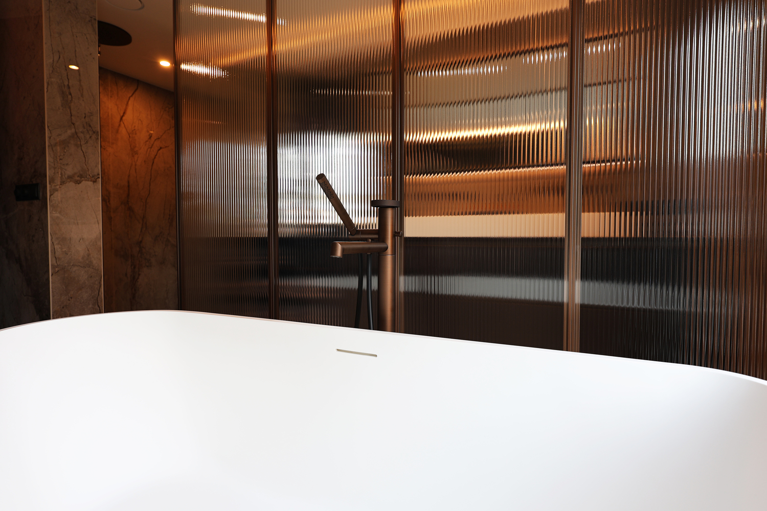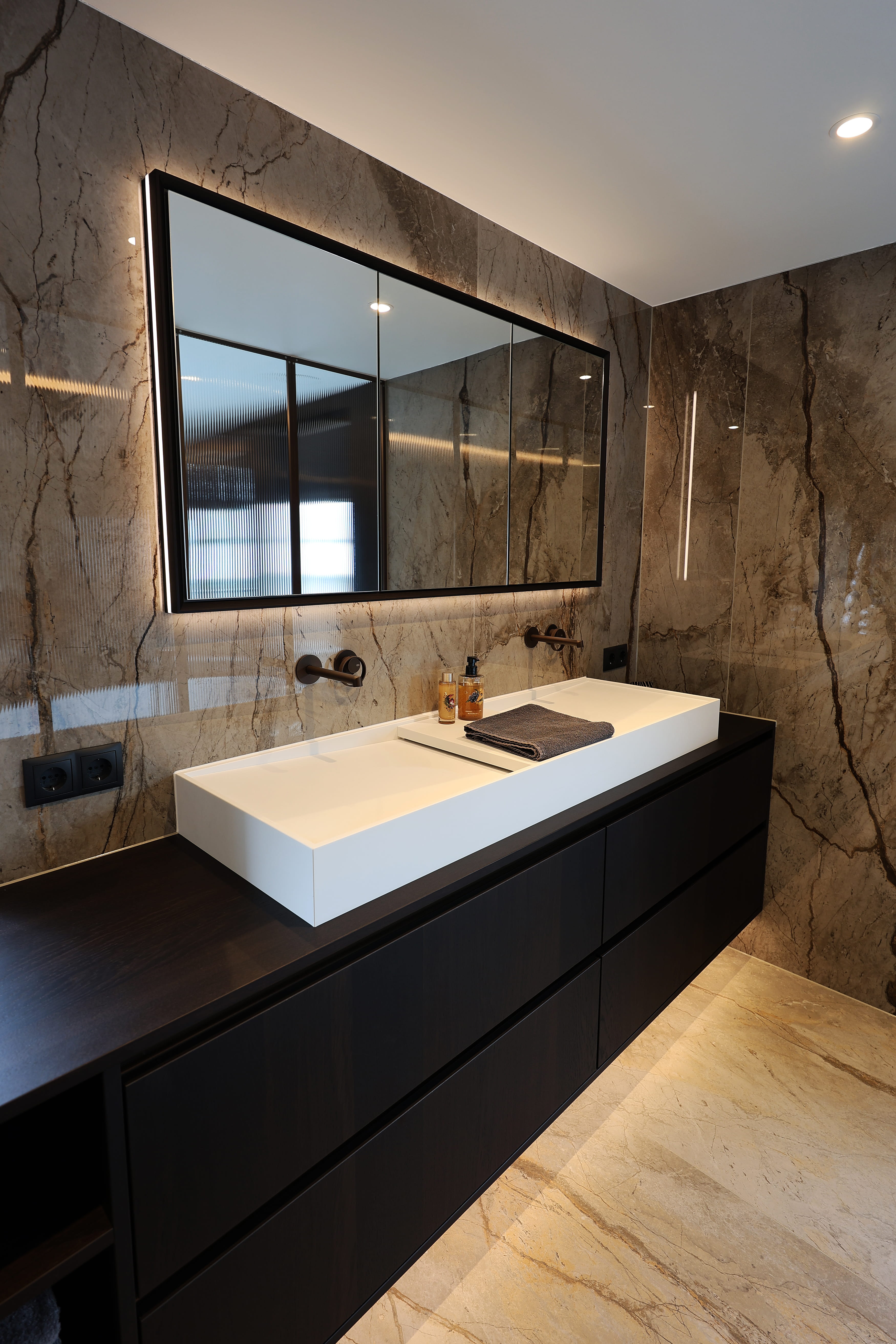Deze badkamer vormt een subtiele overgang tussen slaap- en leefruimte. Het marmer geeft diepte en karakter, terwijl het geribbelde glas zorgt voor een zachte scheiding zonder het open gevoel te verliezen. Licht, materiaal en proportie komen samen in een ruimte die kalm en uitgebalanceerd aanvoelt.